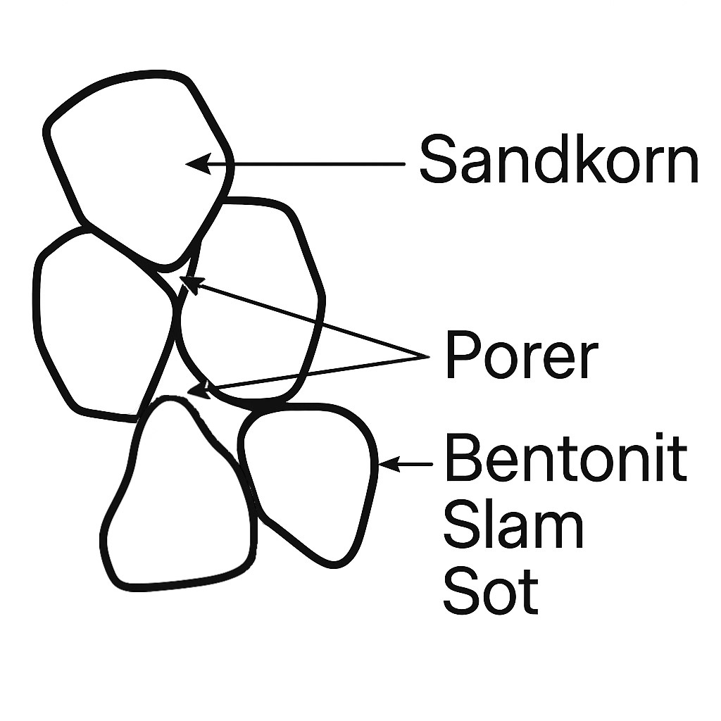 Bindemedlet i råsanden är bentonit, ett mineral som består av platta skivor i lager ovanpå varandra. Utrymmet mellan skivorna fylls med vatten när vi tillför fukt till sanden. Bentoniten tar större plats, och vi säger att bentoniten ”sväller”.
