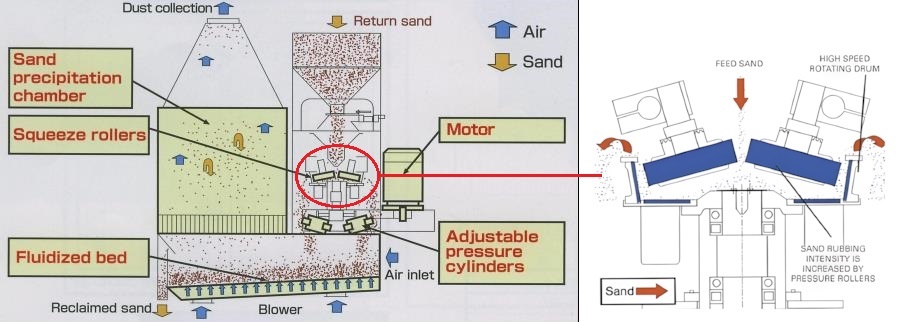 Sanden som ska renas innehåller klumpar av form och/eller kärnsand samt vissa metallrester. En klumpkross krossar sandklumparna. Sedan används magnetseparering för att få den fri från metallrester. Därefter siktas materialet och går sedan till någon form av torkning då sanden kan innehålla en del fukt.