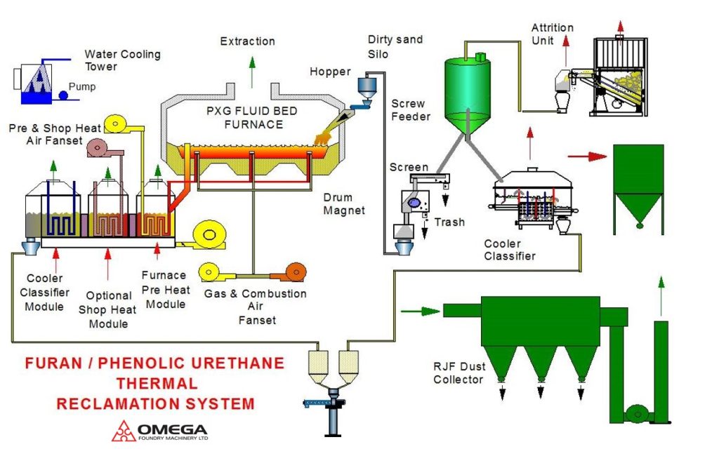 I anläggningen i figuren ovan transporterar en skruvtransportör (1) den sand som skall återvinnas in i den cylindriska kalcineringskammaren (2). Bottenplattan i denna, som är tillverkad i rostfritt stål, är försedd med fluidiseringsmunstycken och koaxialt arrangerade matningsrör. Luft och gas blandas direkt i förbränningskammaren. Sanden passerar in i en förkylare (rekuperator) (3), som omfattar två flytande bäddar, där sanden kyls till cirka 200ºC och luften förvärms till cirka 500ºC. Därefter passerar sanden genom en slutlig kylare (4), som innehåller ett rörnät i vilket kylvatten cirkulerar. Från kylaren passerar sanden slutligen genom en vibrationssikt (5) där föroreningar och grövre kornaggregat avlägsnas.