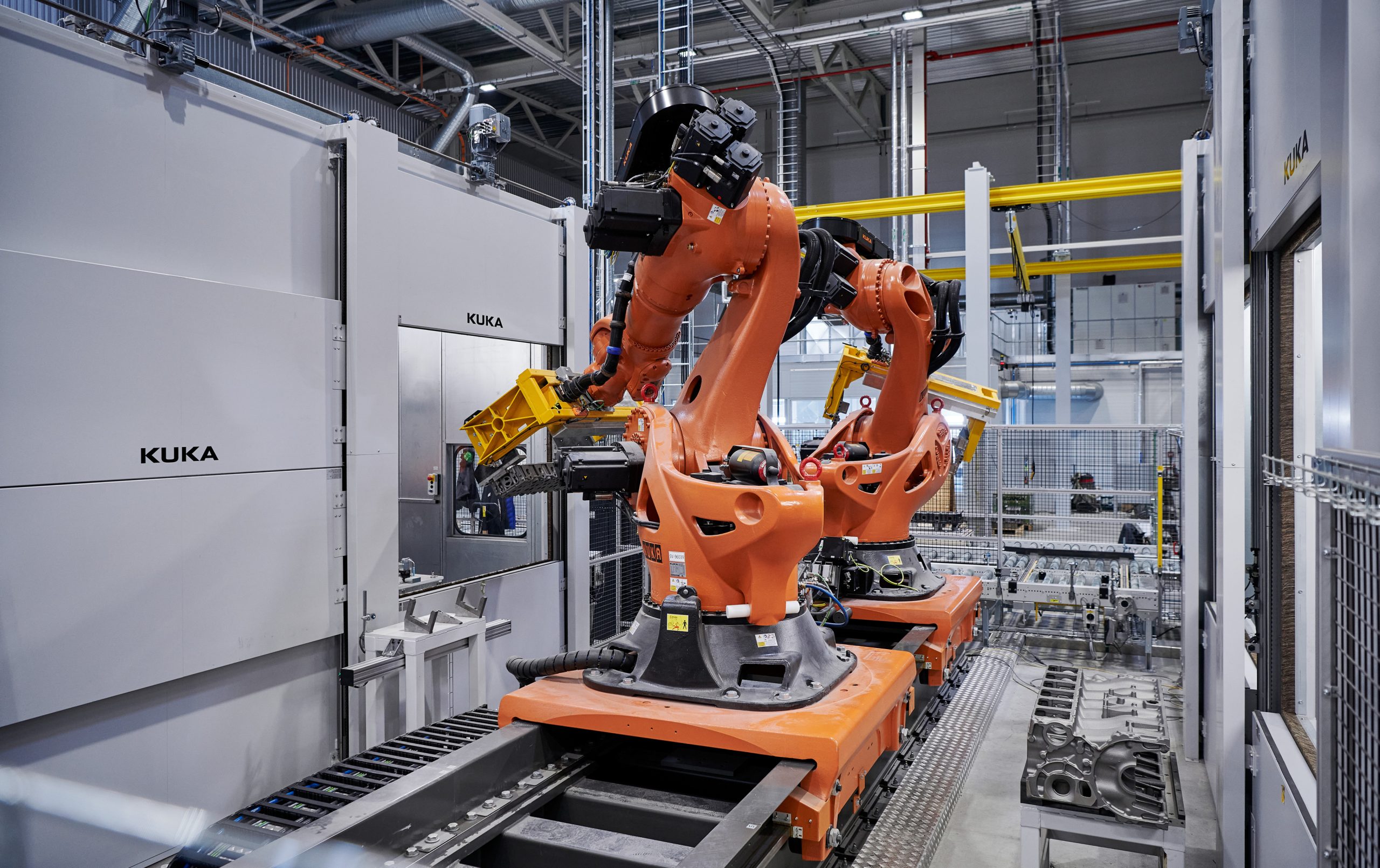 - Den mindre av de två maskinerna på Scania är försedd med en ABB-robot för hantering av gods. På grund av den höga vikten på motorblocken (cirka 350 kilo) är detta inte möjligt vid den större maskin. En större portalrobot skulle dock kunna lösa detta problem, med en betydande reducering av riskerna för tappat gods och allvarliga klämskador.