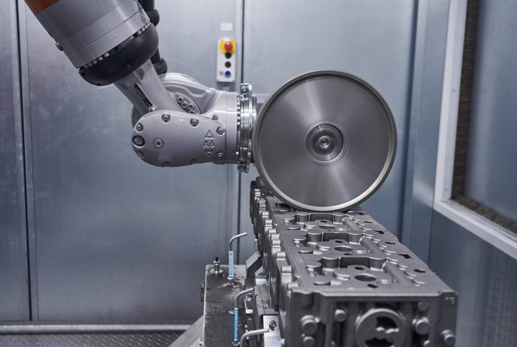 Livslängden hos denna utrustning är ungefär 50 driftstimmar. Byte sker på cirka två minuter. Maskinens styrning väljer hur ofta slipskivan skall kontrolleras och skärpas. Den avgörande faktorn är främst hur mycket grader, som behöver slipas bort från gjutgodset.