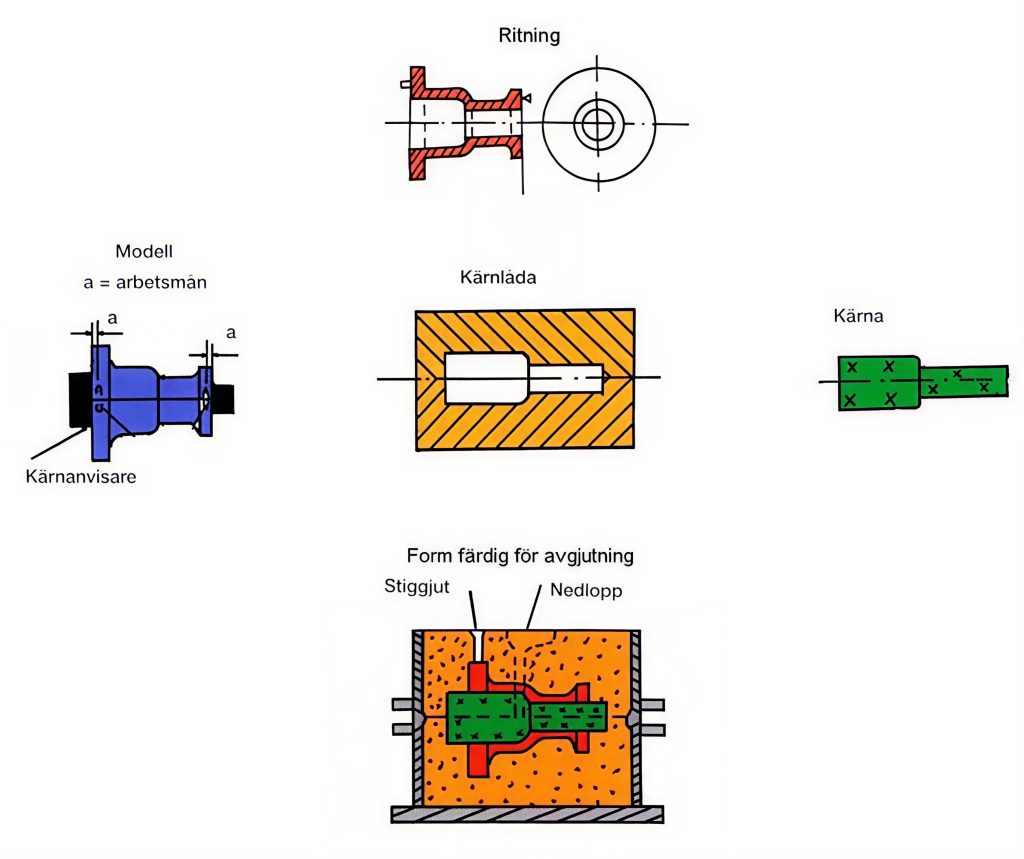 Kärnan läggs därefter i underformen (figuren nedan). Det är viktigt att kärnan läggs i ett bestämt läge i formen. Därför görs den ofta längre än själva gjutstycket. För att ge plats åt kärnan i formen är modellen försedd med så kallade kärnanvisare. Dessa ger ett hålrum i formen, avsett för den förlängda kärnan. Efter kärniläggning läggs formhalvorna ihop. De styrs i förhållande till varandra med hjälp av styrdubbar och bussningar. Formen är därefter klar för avgjutning.Vid avgjutningen strömmar den smälta metallen genom ingjutssystemet in i de formrum, som bildats vid formningen.