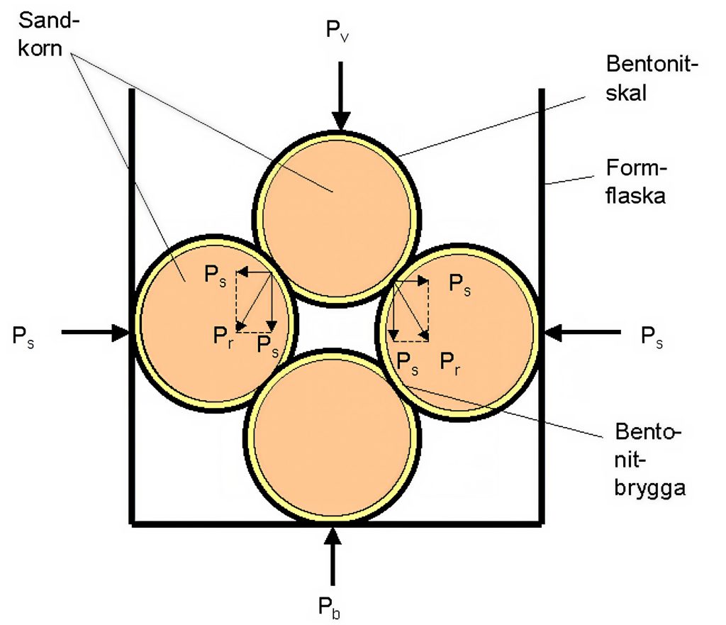För att kunna förstå vad som händer med formmassan under formningen visas förhållandet schematiskt i figur 13 nedan. Vid de konventionella formmaskinerna sker formpackningen med en kraft verkande på formens överyta. I det ögonblick då formmassan påverkas av denna vertikala kraft (Pv) uppstår friktion i kontaktytorna mellan sandkornen. Denna friktion motverkar en jämn packning och därmed lika hårdhet i formens olika delar. Detta kan förklaras med att packningskraften kan uppdelas i en horisontell och en nedåtgående komponent. Även om den horisontella kraften hela tiden är mindre än den vertikala så förloras en del av den nedåtgående kraften på grund av friktion mellan sandkornen. Denna minskning av den nedåtgående kraften begränsar det område där packning kan ske. Den konventionella pressmetoden vid formning är därför endast användbar vid formar med begränsad höjd eftersom hårdheten vid modellytan avtar med ökande höjd på formen.