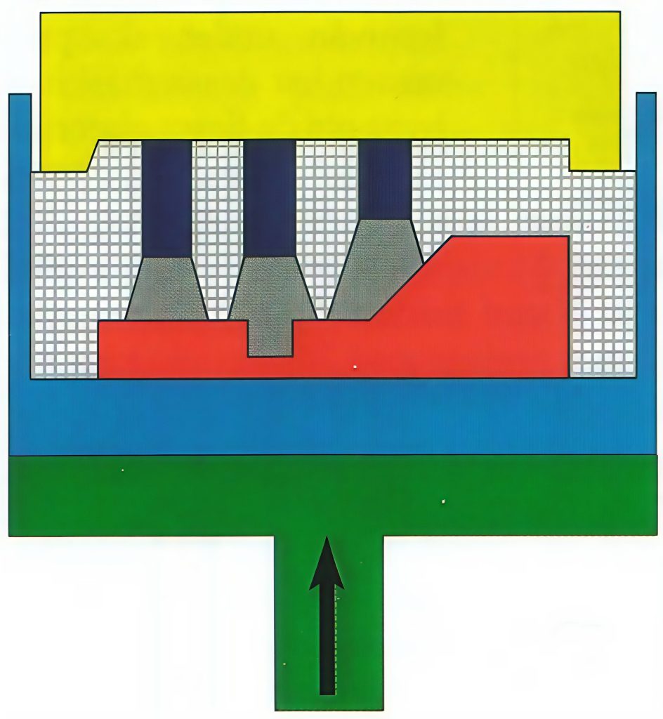 För att man ska få ett bättre resultat vid formpackning genom pressning har pressplattor som kan följa modellkonturen bättre tagits fram. En av dessa tekniker är den på figur 14 nedan visade tekniken med flerstämpelhuvud. Vid denna packningsteknik påverkas packningsgraden i mindre grad av modellkonturen. På de ställen där modellen är lägst trycks stämpeln längre ner till dess att önskat tryck uppnåtts. Därigenom blir det en jämnare packning av formmassan över hela modellplattan. Tekniken med flerstämpelhuvud är ofta nödvändigt för att man ska få jämn packning. Nackdelen är att formmaskinen blir dyrare. Flerstämpelmetoden är dock mycket allsidig och används därför i praktiken i stor omfattning.