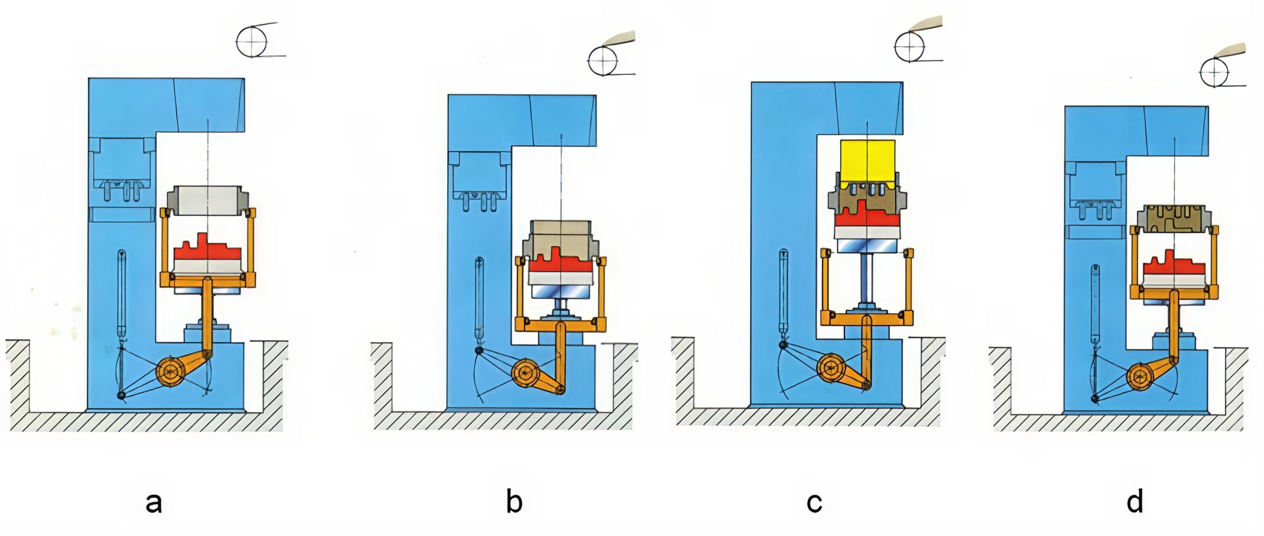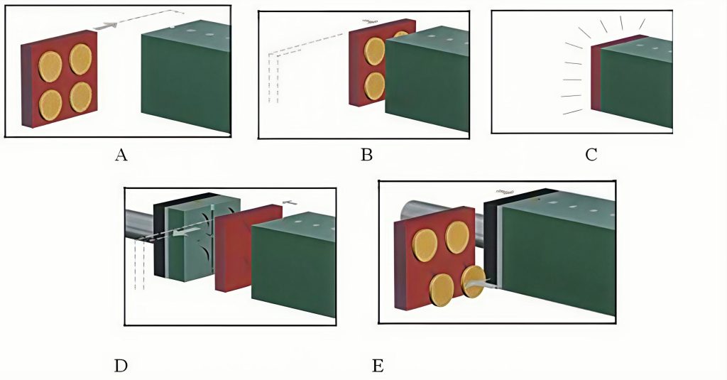 D: Utskjutning av bullen från blåsstationen. Den hydrauliska kolven sätter sig i rörelse och skjuter bullen sakta framåt, så att den kommer i kontakt med raden av tidigare tillverkade bullar. Kolven fortsätter att röra sig till hela raden av bullar har skjutits ett steg framåt.