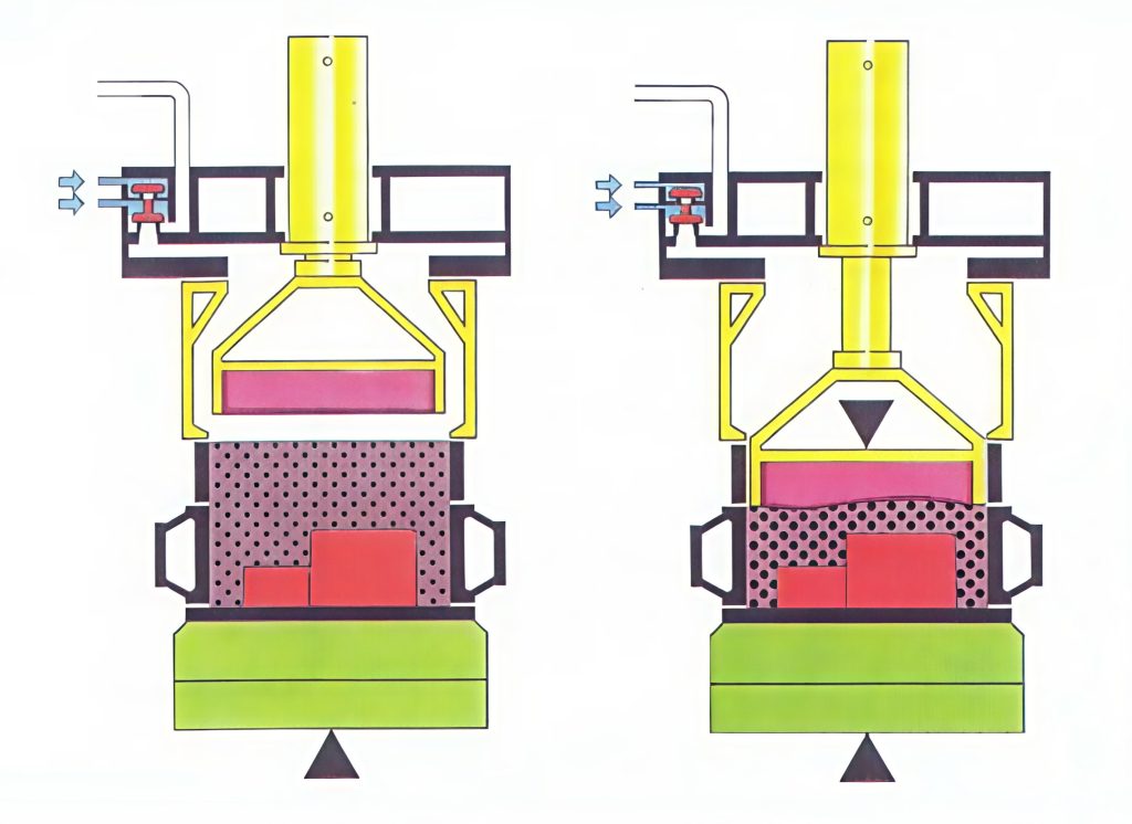 Hur tryckvågen som utför det nödvändiga packningsarbetet åstadkommes i praktiken visas i figuren endan. En tryckbehållare är fylld med luft med förinställt tryck. Genom att avlägsna mottrycket på impulsventilen, öppnar ventilen på några få millisekunder. Det påverkar formmassan med en tryckgradient på mellan 110 och 300 bar per sekund och lufttryckets kinetiska energi överförs till formmassan.