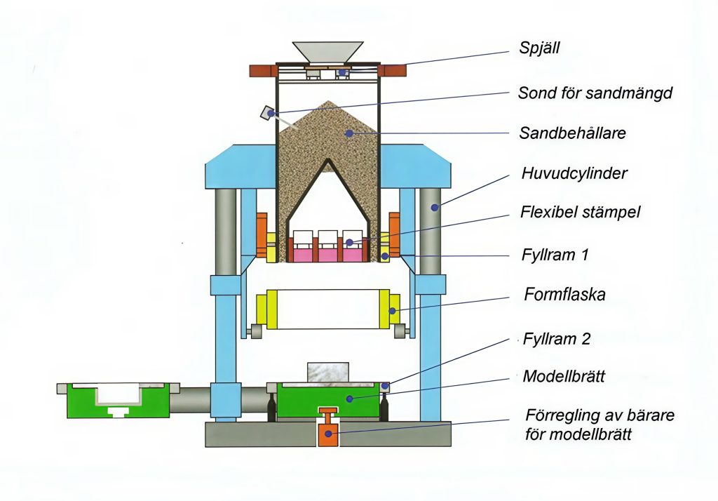 I den på figur 18 nedan visade maskinen sker formningen genom att formmassan efter påfyllning pressas både uppifrån och underifrån. Innan pressningen blåses luft genom formmassan – den fluidiseras. Genom fluidiseringen och pressningen både uppifrån och nedifrån uppnås en jämnare formhårdhet runt modellen än vid konventionell formningsteknik med enbart pressning från ett håll. Maskiner med denna konstruktion uppges ha en lägre energiförbrukning och en lägre bullernivå än tidigare maskiner beroende på att man inte använder skakning.