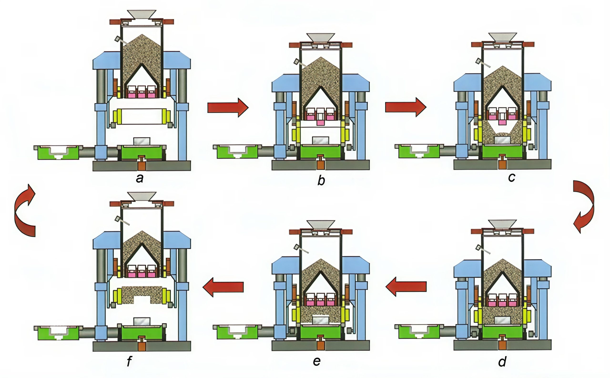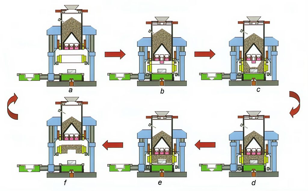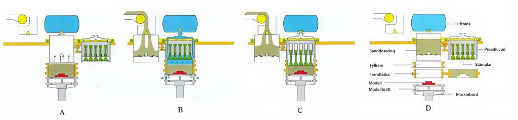 D: Under kompakteringsprocessen fylls behållaren för formmassa på nytt. Form och modell delas genom sänkning av maskinbordet. Därefter går behållaren för formmassa och presshuvudet tillbaka till sina utgångspositioner.