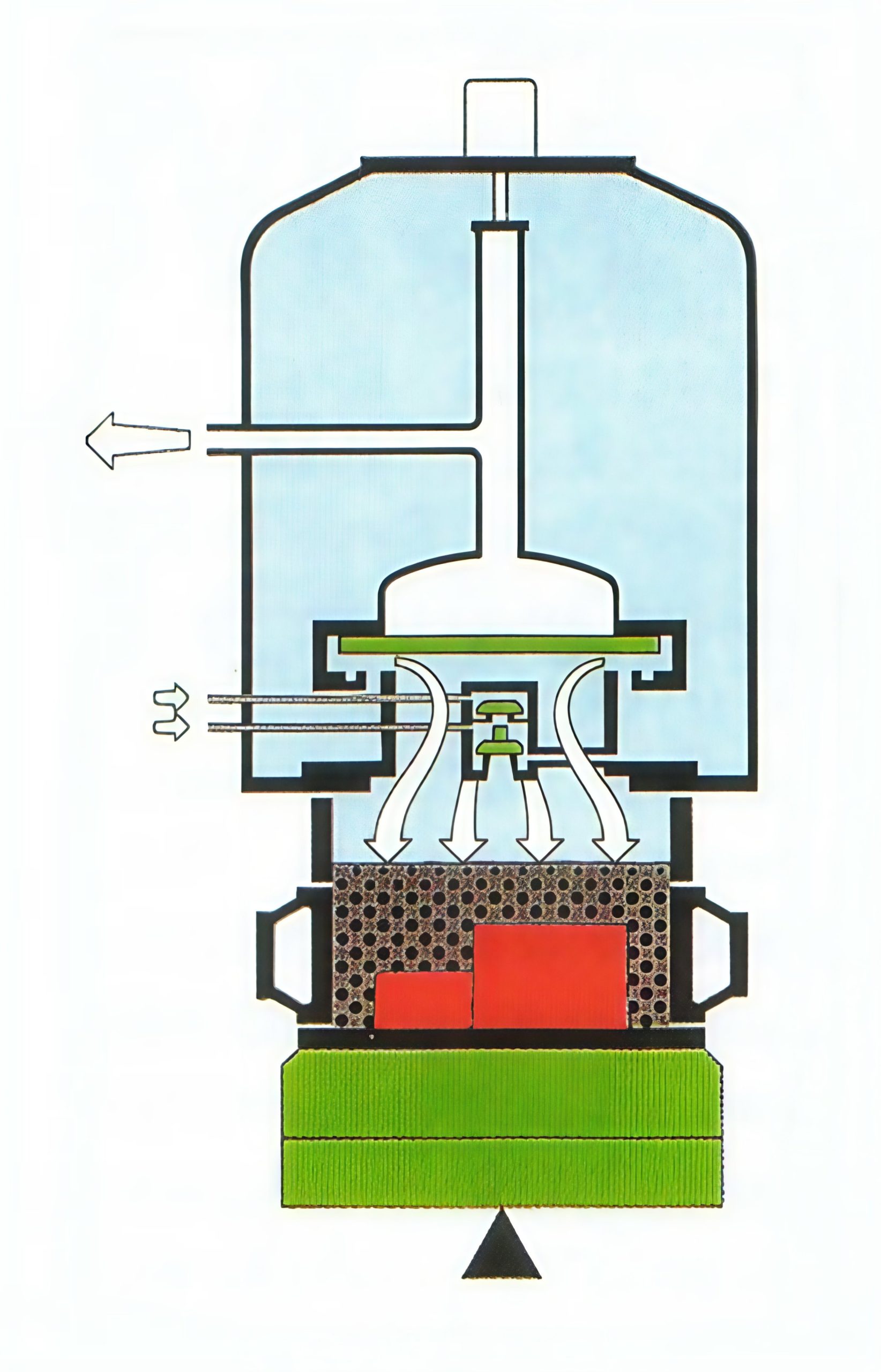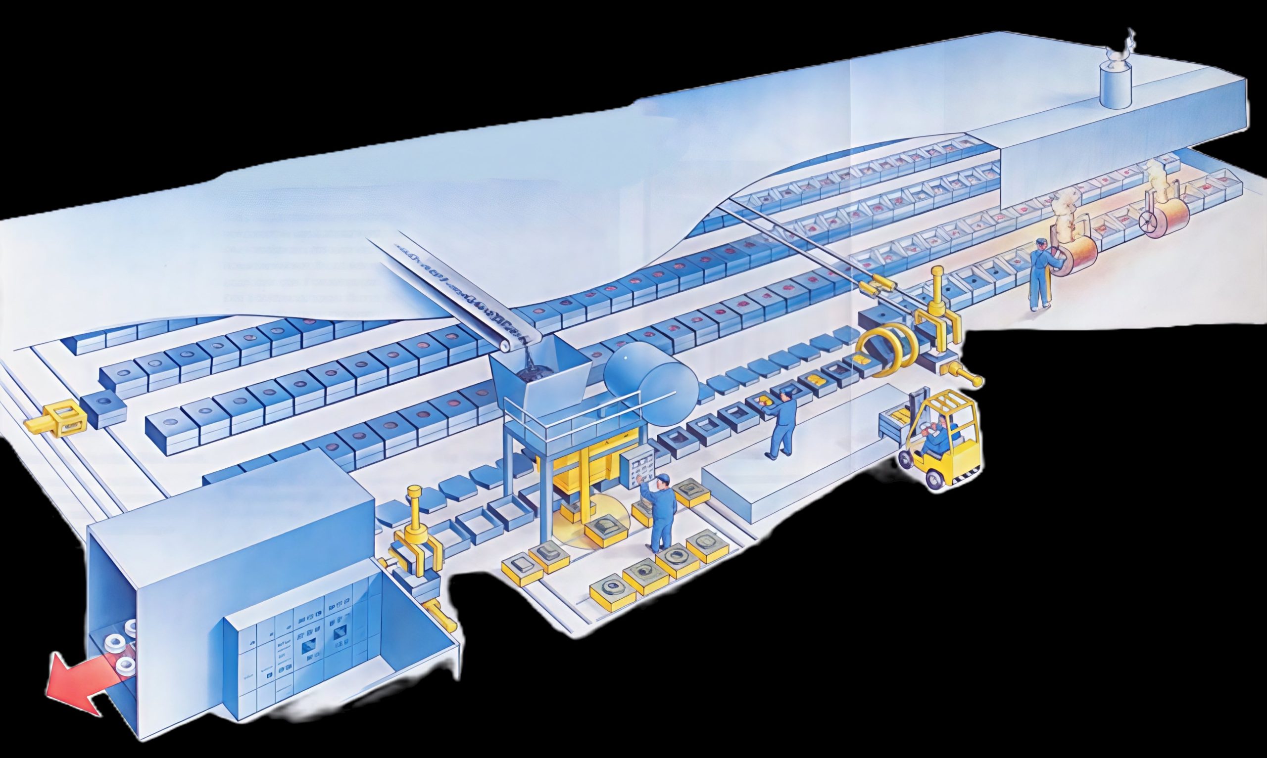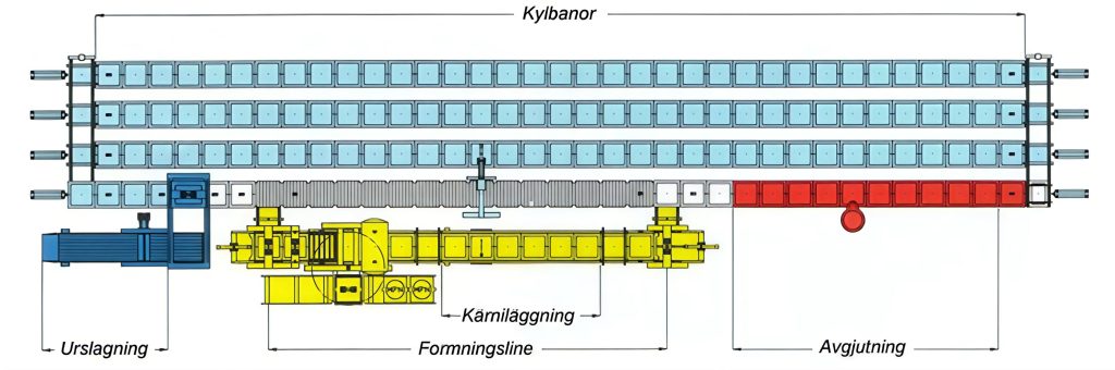 Anläggningen förses med formmassa från en anknuten sandberedning, kärnor från ett närliggande kärnmakeri och smält järn från ett smältverk i samma byggnad. Det tillverkade gjutgodset matas från urslagningsstationen via skakroster för skiljande av gods och formmassa in i en lång kyltunnel, där godset under transporten till renseriet kyls ner till cirka 80°C med kylluft.