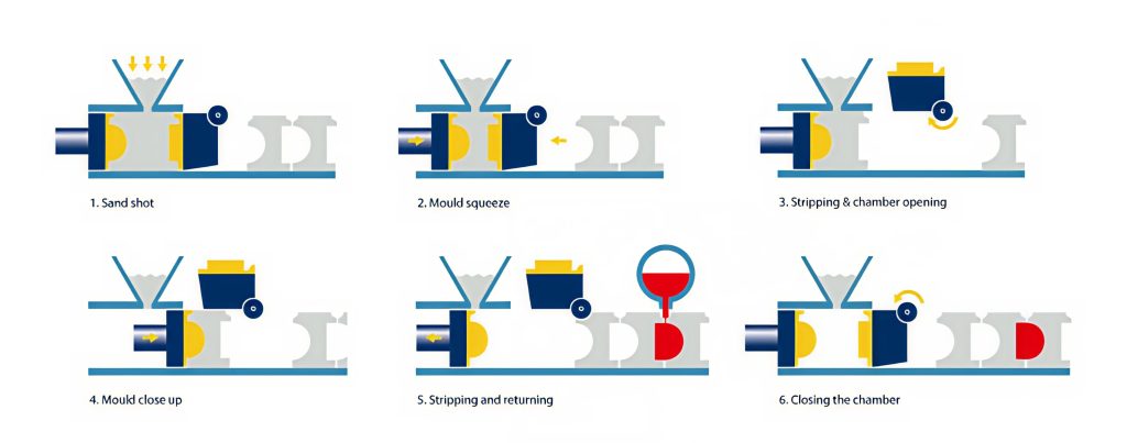 Råsandsformmassan komprimeras först genom en förskakning och sedan genom samtidig skakning och pressning. Överformen, som formas i den första maskinen, passerar genom den andra maskinen, som tillverkar underformen. På banan efter formmaskinerna matas därför växelvis ut över- och underformar. Partytan är på båda formarna vänd nedåt. I detta läge är således underformen ”felvänd”.