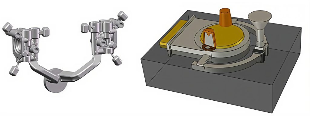 Figurerna nedan visar två olika komponenter där den till vänster är ett pressgjutet ämne och den till höger är gravitationsgjutet i en sandform. I båda fallen är de kompletta gjutsystemen medtagna för att ge ett optimalt simuleringsresultat. För detaljen till höger finns även formens storlek med, vilket normalt sett inte är nödvändigt.