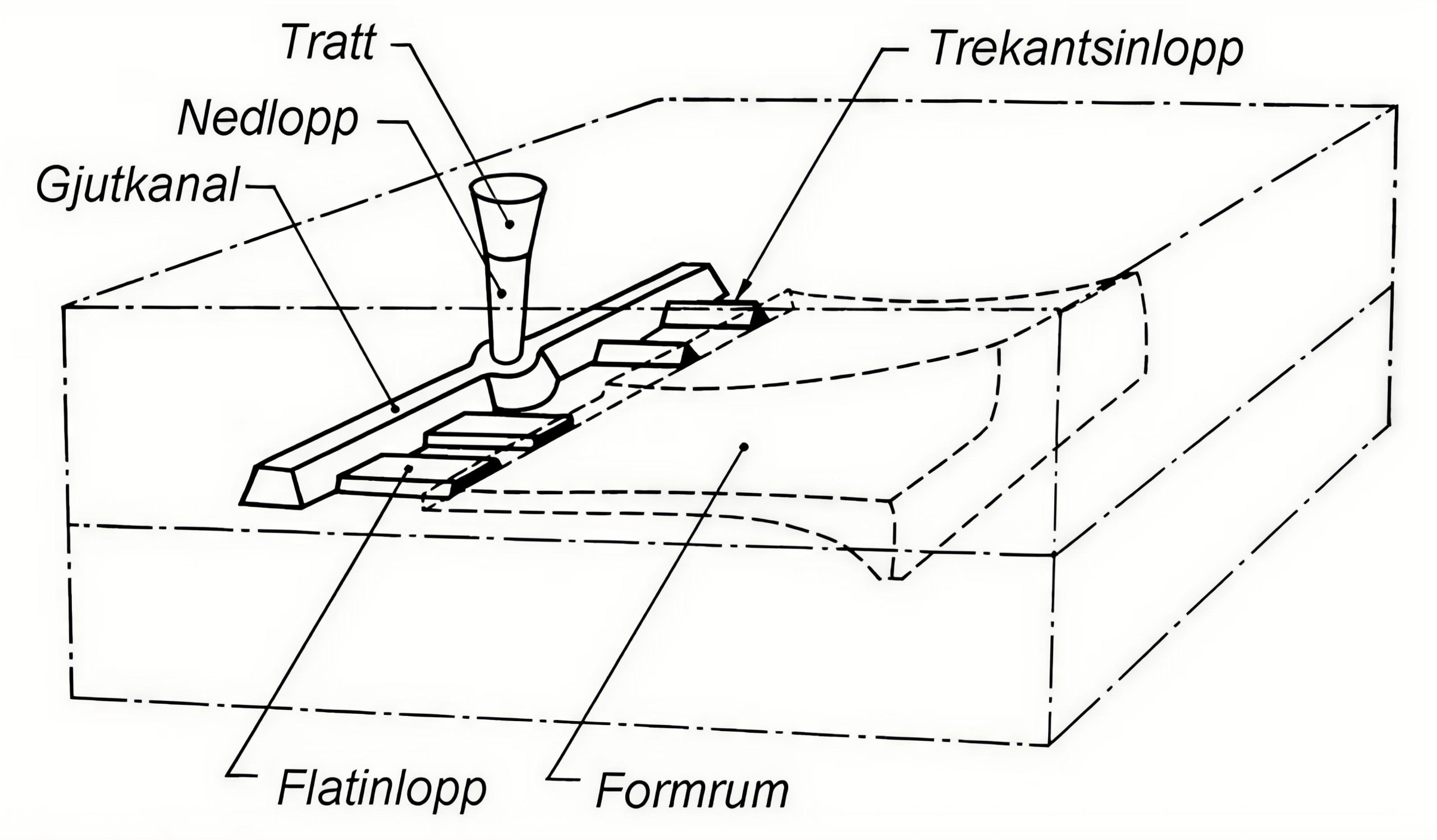 De vanligaste delarna som bygger upp ett ingjutssystem framgår av följande figur. Tratten ersätts ofta med en gjutskål och ofta läggs ett filter in i ingjutssystemet.
