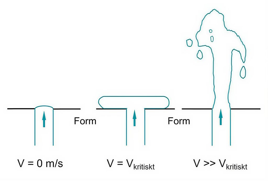 Beroende på hur gjutsystemet utformas är det möjligt att styra eller minimera mängden ny oxid på ytan av smältan. Genom försök av bland annat professor John Campbell så har den kritiska hastigheten, där mer oxider tillförs till smältan, angetts till cirka 0,5 m/s. Den kritiska hastigheten hos den framströmmande smältfronten ligger i storleksordningen på 0,4 m/s för ”tunga” legeringar som järn-, stål- och bronslegeringar. För aluminiumlegeringar är den kritiska hastigheten 0,5 m/s och för magnesiumlegeringar 0,6 m/s. Figuren nedanvisar schematiskt hur det kan se ut vid olika hastigheter hos smältan när den rinner in i formrummet.