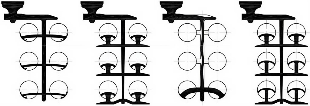 Figur 20. Schematisk fyllnad av formen med fyra ingjutsalternativ i ett tidigt skede av gjutningen.