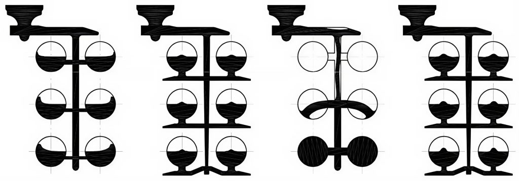 De två figurerna visar de olika alternativen av fyllnadsförloppet. Längst till vänster ses det trycksatta inloppet medan nummer tre är det öppna systemet med minsta arean strax efter gjutkoppen.